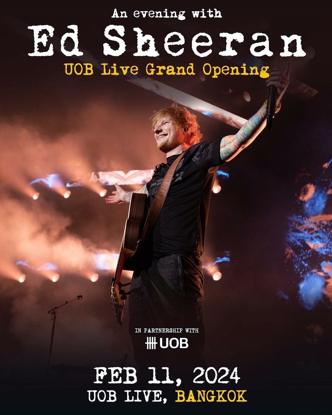 After his highly anticipated + – = ÷ x Tour at Bangkok’s Rajamangala National Stadium, Ed Sheeran will play a special show at UOB LIVE, Bangkok’s new, state-of-the-art live entertainment venue, on Sunday, February 11, 2024.