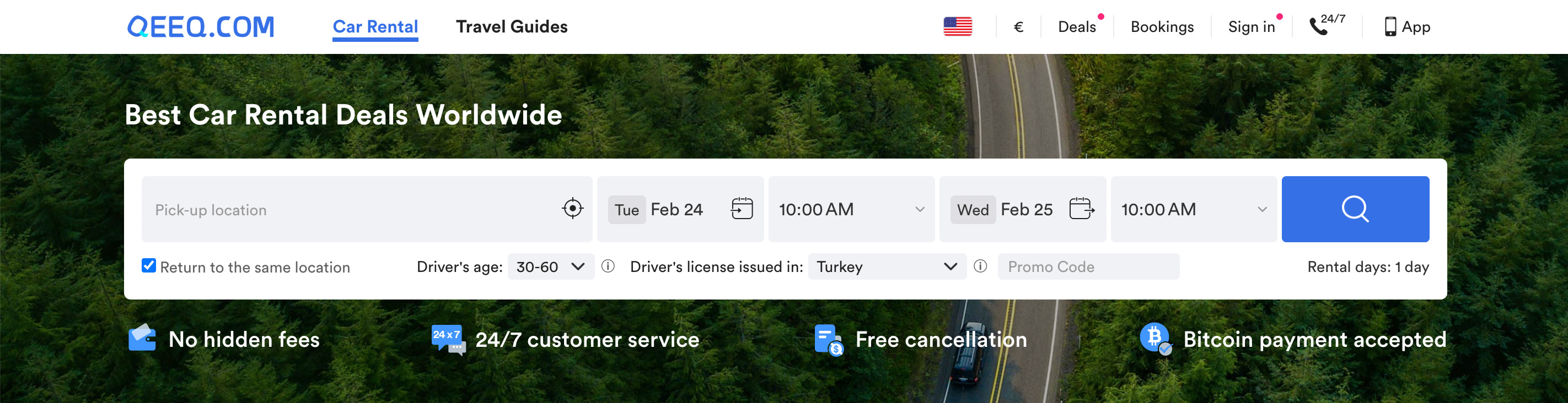 With QEEQ, you can compare car rental deals worldwide in seconds — no hidden fees, free cancellation, and 24/7 customer support wherever the road takes you. Pick up your car, return it to the same location, and focus on what really matters: the drive, the views, and the freedom to explore on your own terms.