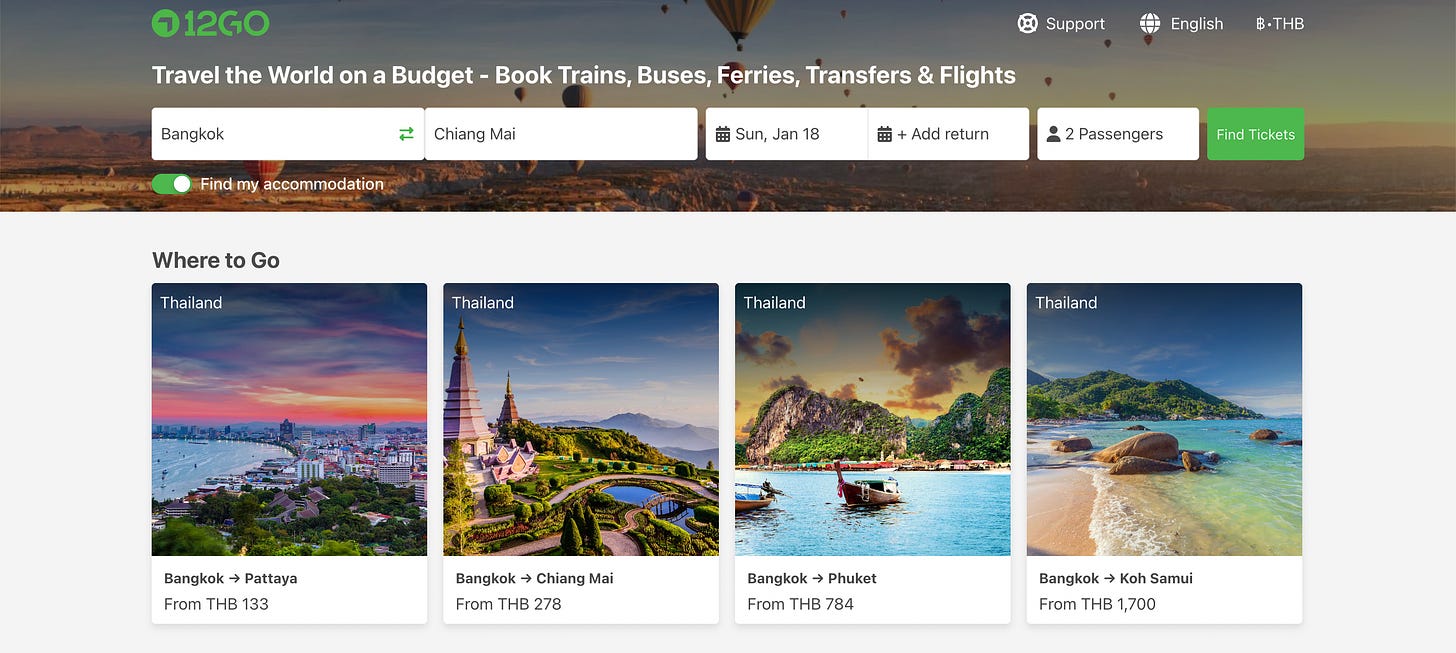 With 12GO, you can book trains, buses, ferries, transfers and flights in one simple platform. And for a limited time, you get 5% OFF your transport bookings with our exclusive promo code.