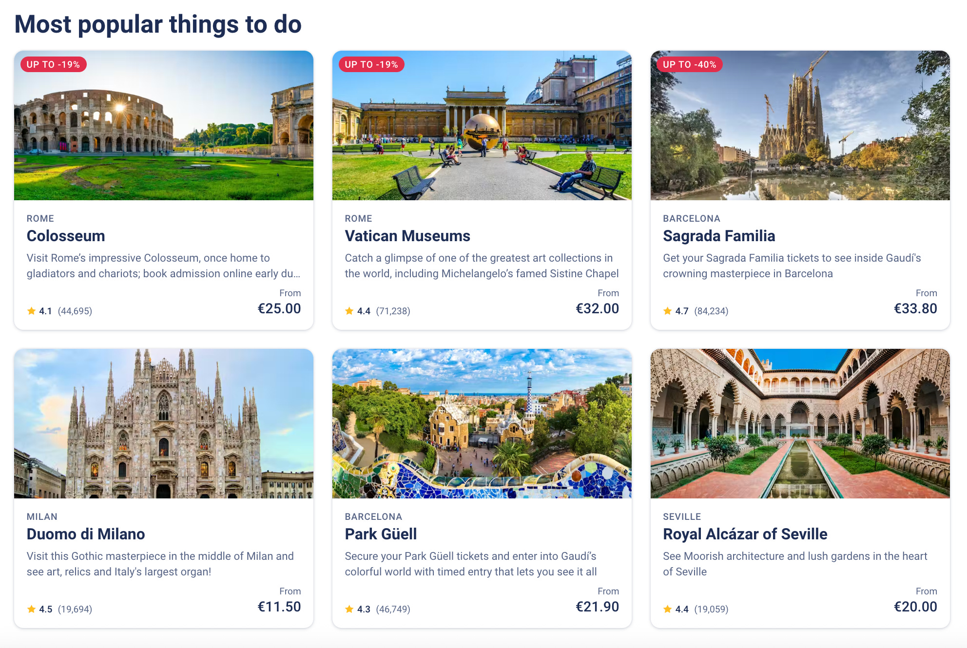 Sagrada Familia, Barcelona Get your tickets to see inside Gaudi’s crowning masterpiece. It’s a cathedral like no other in the world. 💰 From €33.80 | ⭐ 4.7 (84,234 reviews) 👉 Grab Your Tickets – Up to 40% Off