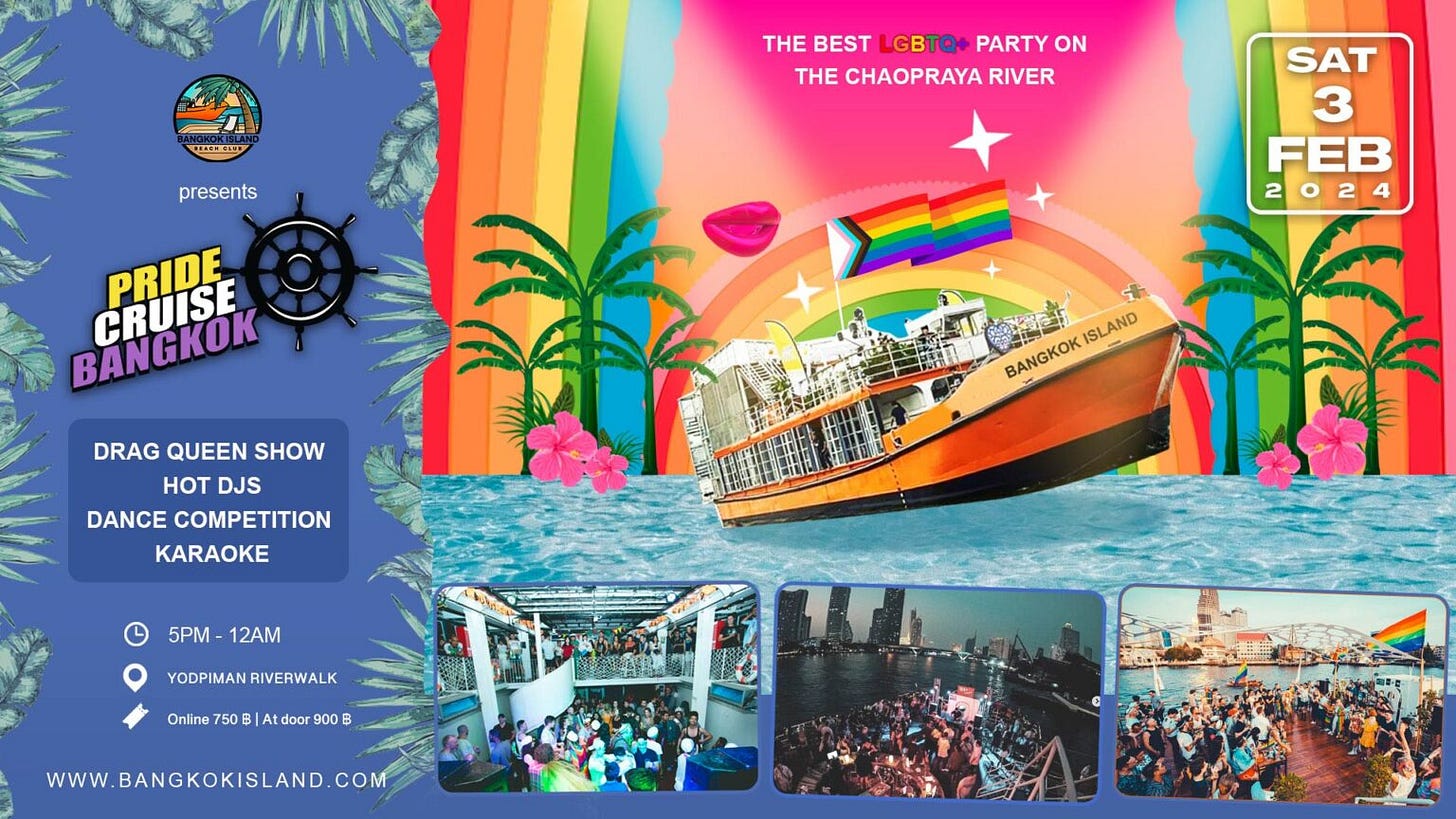 Embark on a journey of love and diversity at Pride Cruise Bangkok! Set sail on 3rd February, Saturday aboard Bangkok Island for an exhilarating festival featuring shows, DJs, drag queens, karaoke, dance competitions, and much more. Let your heart soar as you dive into the vibrant atmosphere!